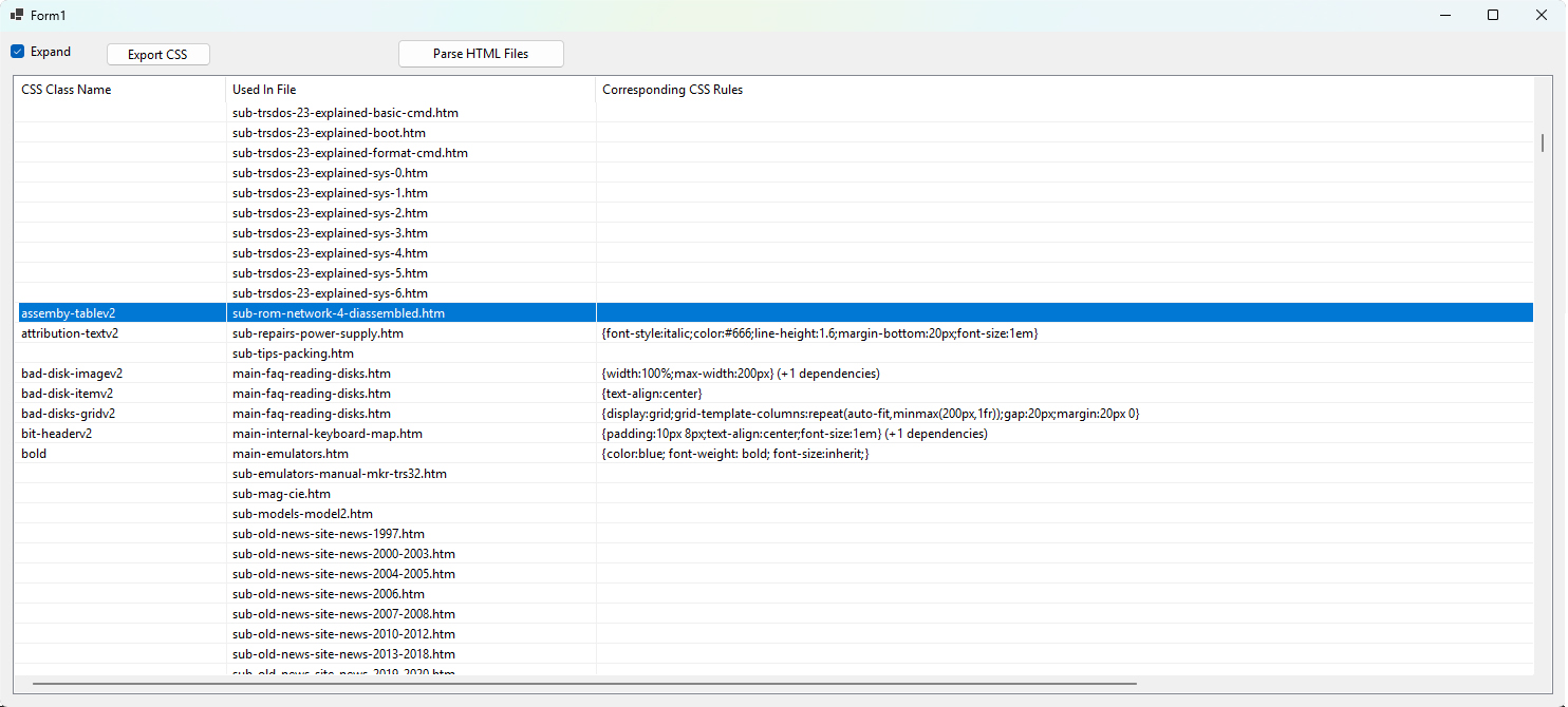 For the rest of the pages, I had Gemini write some Visual BASIC Code to parse every html file, extract every class used, and come up with a display that would show me the class, the code, and the files which use it. I also had to have it let me know about dependencies after a particularly disasterous attempt to globally update the code.