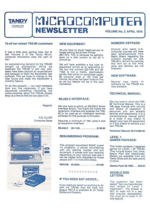 Issue: Vol 01 Issue 02Publisher: Tandy ElectronicsYear: 1979Size: 741,743Pages: 2OCRed: YesDate: 1979-04Issue Details: HereDownload: here
