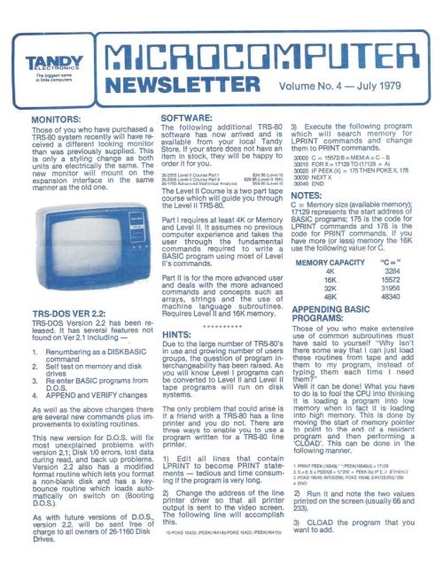 Issue: Vol 01 Issue 04Publisher: Tandy ElectronicsYear: 1979Size: 844,542Pages: 2OCRed: YesDate: 1979-07Issue Details: HereDownload: here