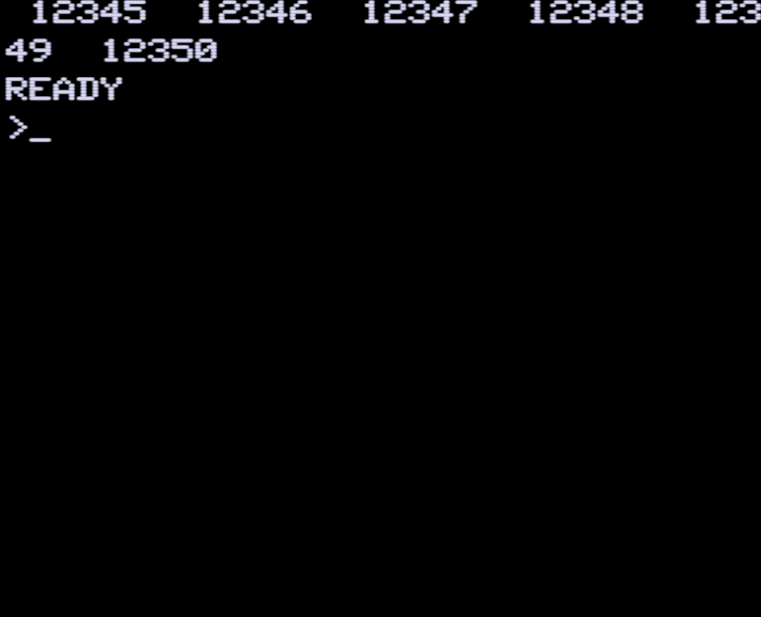 20 FOR X = 12345 TO 12350:PRINT X;:NEXT
