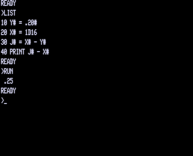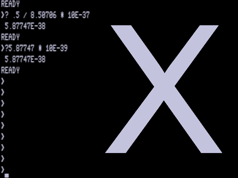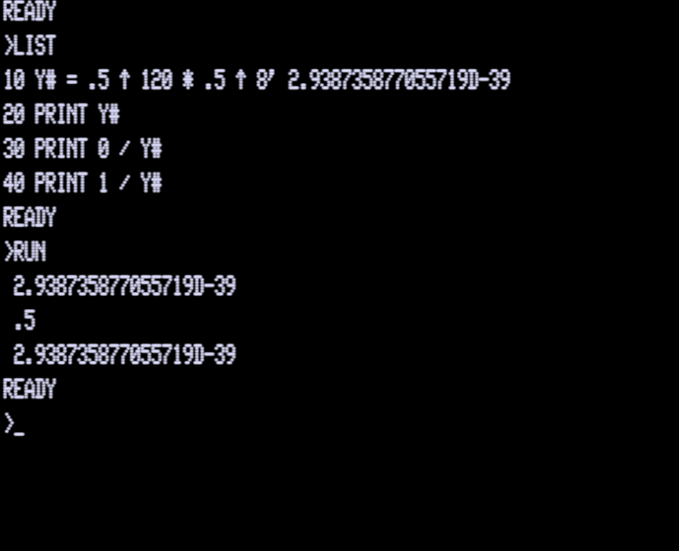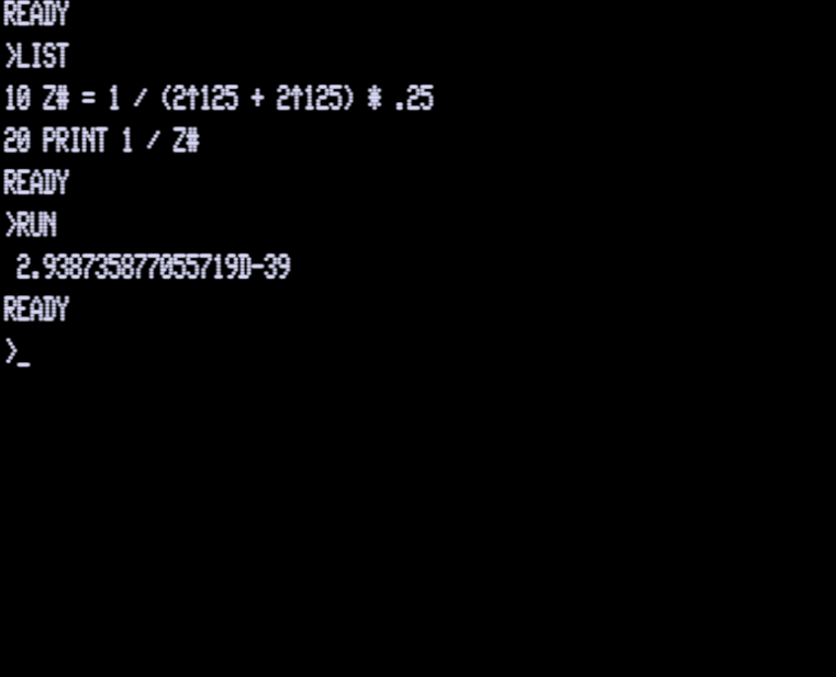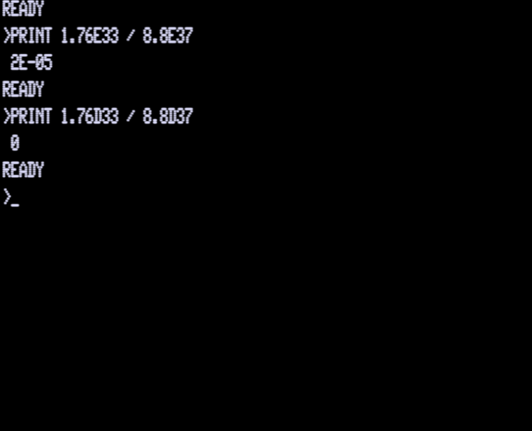 20 PRINT Z# / 1 'displays 0 instead of 2.938735877055719D-39