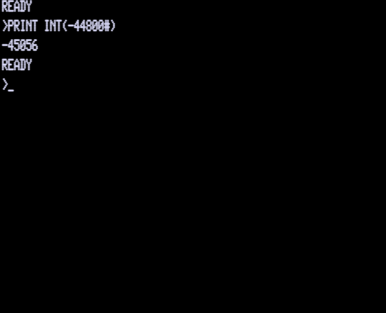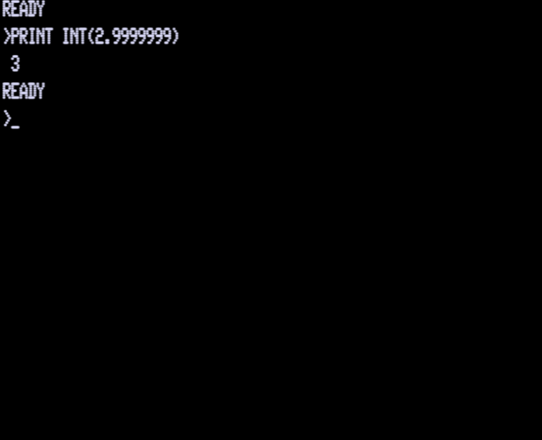 EXPECTATION: INT(value) should produce a result equal to or less than value. However, if the value is double-precision (by definition), the ROM rounds value to single-precision first, then performs the INT function. e.g.,