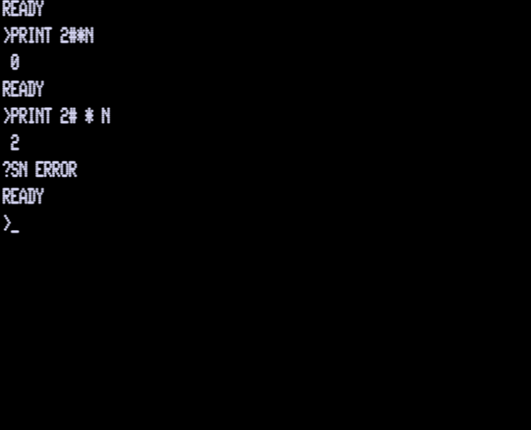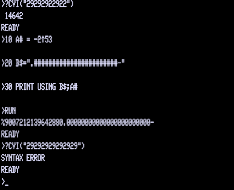 EXPECTATION: PRINT USING should not clobber code from 4152H through 415BH disabling CVI, FN, CVS, and DEF. BASIC 01.01.02 just clobbers the space and 'i' in the " in " message.