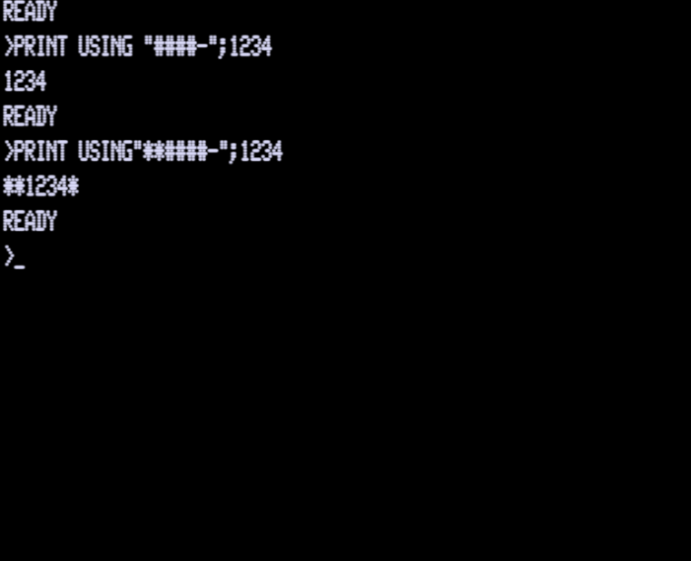 RULE: A PRINT USING statement with a negative sign at the end of the field prints a negative sign after negative numbers and prints a space for positive numbers. However, if the field specifiers in the string also has two asterisks at the beginning of the field, the ROM prints an asterisk instead of a space after a positive number.