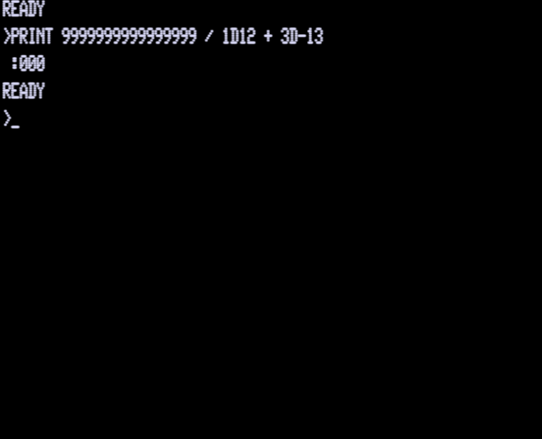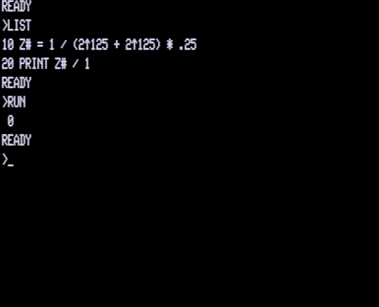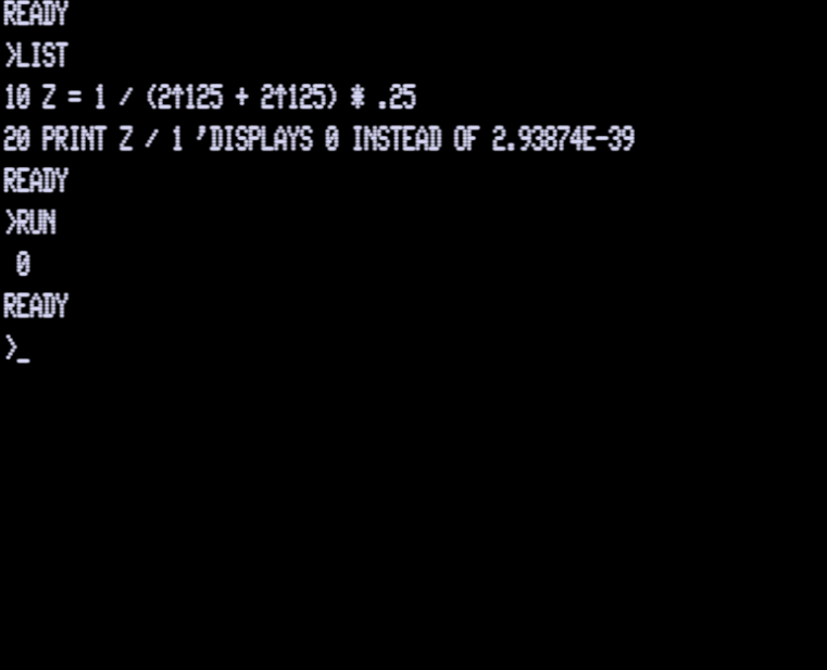 20 PRINT Z / 1 'displays 0 instead of 2.93874E-39