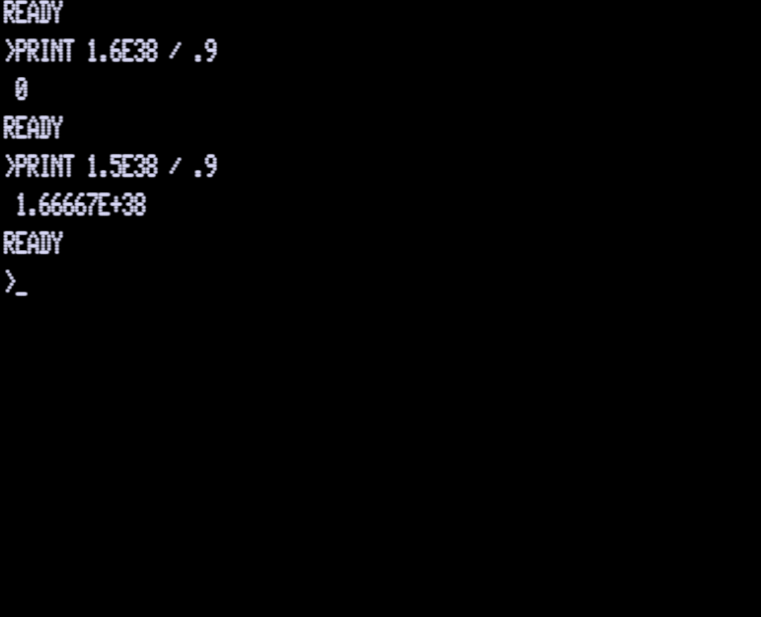20 PRINT 1 / Z# 'displays 2.938735877055719D-39 instead of overflow