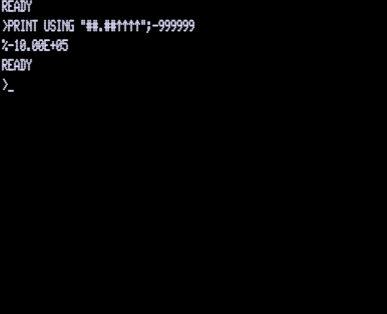 EXPECTATION: When PRINT USING has scientific specifier the rounded value should 'scale' and not indicate the PRINT USING field is not large enough. The ROM fails this expectation. e.g.,