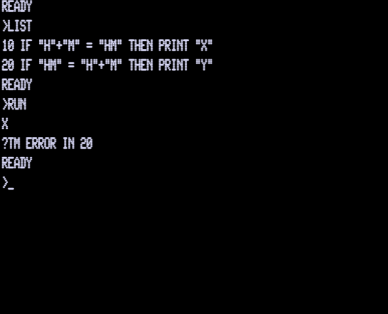 20 IF "hm" = "h"+"m" THEN PRINT "Y"