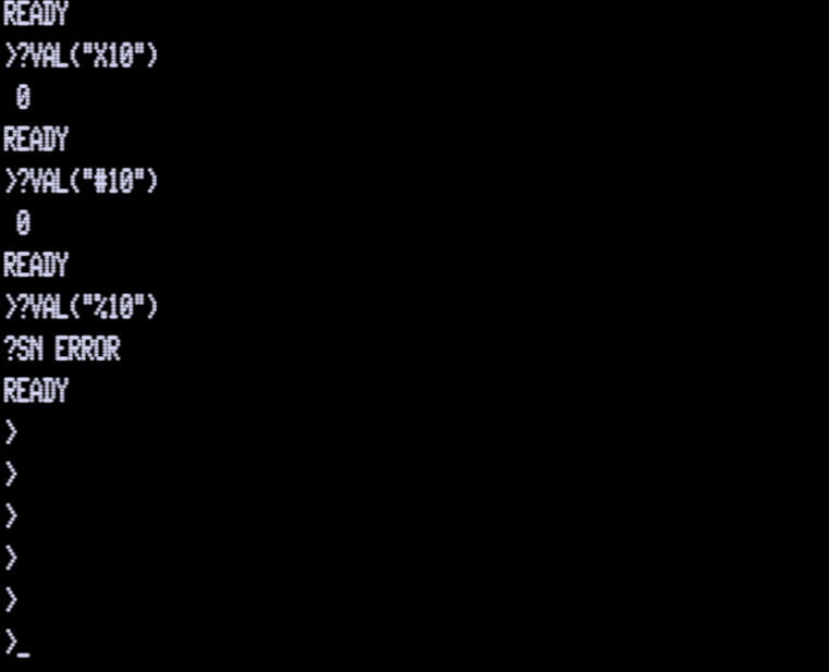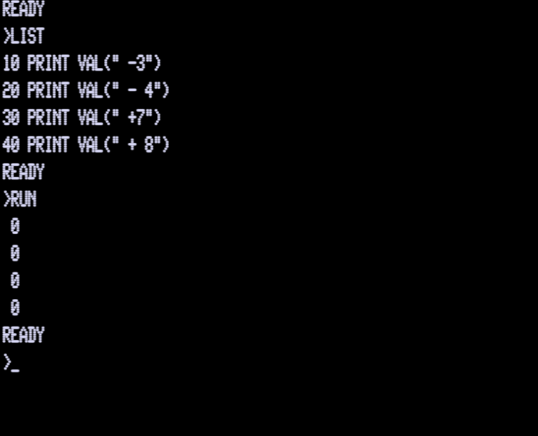 EXPECTATION: A statement with VAL(string) should ignore leading spaces in the string. The ROM loses itself if a space precedes a positive or negative sign. e.g., the following program lines return a zero with the ROM