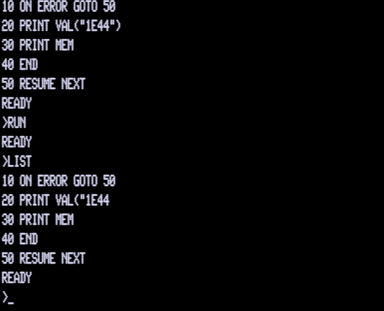 EXPECTATION: A statement with VAL(string) should not corrupt the BASIC program. The following program cannot execute in Microsoft BASIC.
