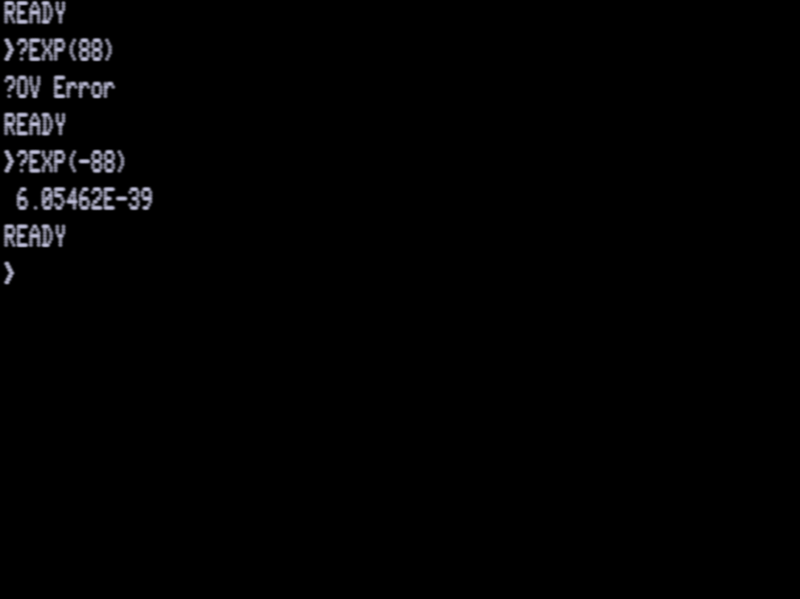Microsoft BASIC indicates overflow if the product is => 8.507059 x 10^37. e.g., EXP(88) = 1.65163 x 10^38 which is less than 1.70141 x 10^38; however, Microsoft BASIC indicates overflow.