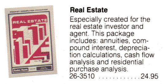 Real Estate. Especially created for the real estate investor and agent. This package includes: annuities, compound interest, depreciation calculations, cash flow analysis, and residential purchase analysis. Depreciation calculations include straight line, declining balance, and sum of the year's digits. A "must" for anyone involved in real estate-time saver! Catalog Number 26-3510 - $24.95.