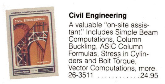 Civil Engineering. Makes the TRS-80 Pocket Computer a valuable "on-site assistant." Programs include Simple Beam Computations, Column Buckling and ASIC Column Formulas, Stress in Cylinders and Bolt Torque, Cantilevered Beams, Vector Computations, Fixed Beam Computations, Section Physical Characteristics. Catalog Number 26-3511 - $24.95.