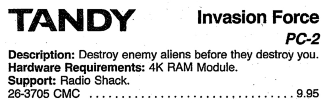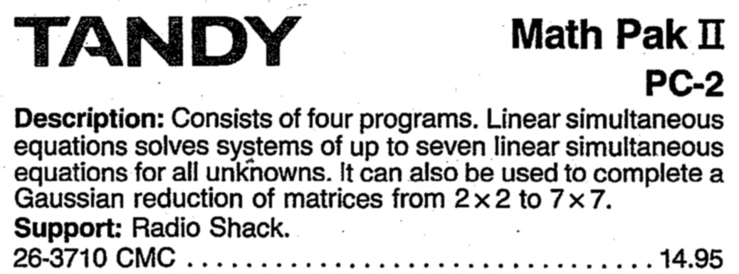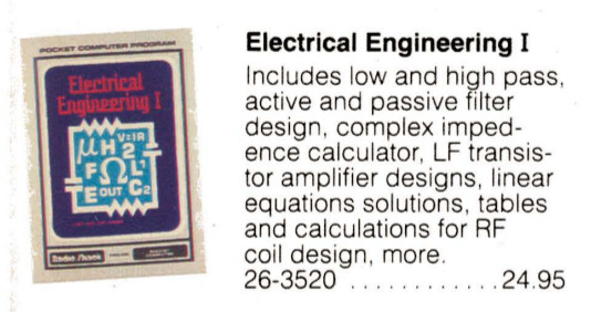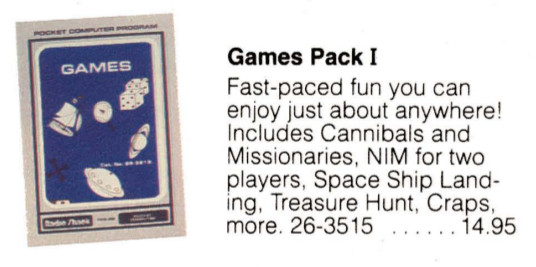 Games Pack I. Fast-paced fun you can enjoy just about anywhere! Includes Cannibals and Missionaries, NIM for two players, Space Ship Landing, Treasure Hunt, Biorhythm Computer, Star Buster, Quick Watson! and Craps. Catalog Number 26-3515 - $14.95.