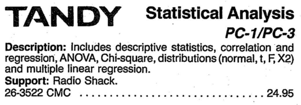 Moving Average. A data set of up to 60 values can be averaged. The number of data points comprising the moving average can be changed without having to re-enter the original data. Normal/T/F Distributions. Given a mean, a standard deviation, and a value for X, this program returns the corresponding Z score, the value of the normal density function f(X), the cumulative percentile P(X), and the area under the normal curve between X and the mean. Calculates one-tail or two-tail probabilities for the t distribution, given a t value and the degrees of freedom. Package also includes programs for Descriptive Statistics, Multiple Regression, and Gompertz Curve Analysis. The Management Decisions program provides ready-to-use formulas for break-even analysis, optimum order quantity, make vs. buy, profit margin, markup, price elasticity, manufacturing cost curve, and random sample. Catalog Number 26-3516 - $19.95.
