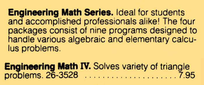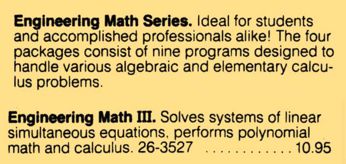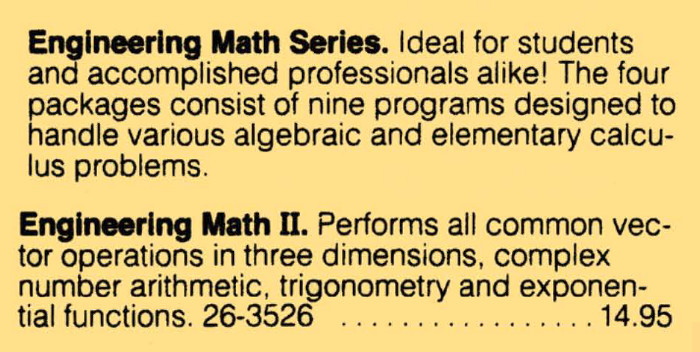 Math Drill. Designed for children in the primary grades. Teaches basic math skills through examples and repetition. The package provides random problems at four levels of difficulty, a math table display and test, a program that allows the parent or teacher to enter problems. For fun, there's a Hi/Lo game that allows a child to guess a random number selected by the computer. Catalog Number 26-3514 - $14.95.