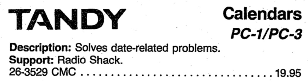 Business Financial. With this package of seven programs, the TRS-80 Pocket Computer becomes a powerful decision-making tool for professionals in the field of finance. The Days and Date program will calculate the number of days between a reference date and a second date, or will find the resulting date when any number of days are added to, or subtracted from the reference date. The Loans and Annuities program uses four primary variables: amount of loan, payment, number of payments, and annual interest rate. Given any three of the variables, it calculates the fourth. A fifth variable, periods/year, permits the user to specify any number of payments per year. Other programs in the package are Future Value, Bond Price and Yield, Internal Rate of Return, Compound Interest, and Depreciation. Catalog Number 26-3517 - $19.95.