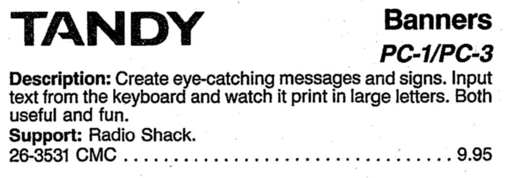 Create big, eye-catching messages and signs. Requires Printer/Cassette Interface.