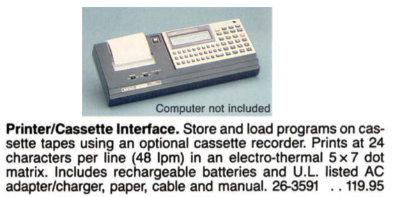 Get the most from your PC-3 with our new thermal dot printer and cassette interface! Provides hard copy, plus lets you save programs on ordinary cassette tapes (requires recorder). Prints 24 characters per line at one line per second, with wrap-around. Slip PC-3 into the Printer/Cassette Interface and you're ready to go! Includes U.L. listed AC adapter/charger, paper, cable, and manual.