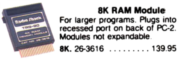 4K RAM Module more than triples the amount of memory in your PC-2. Just plug it into the back. Individual memory modules are non-expandable. 4K Module (26-3615) = $69.96; 8K Module (26-3616) = $139.95.