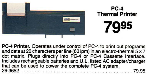 Operates under control of PC-4 to print out programs and data. Use as a printing calculator, too. Prints 20 characters per line (60 lpm) in an electro-thermal 5 x 7 dot matrix. Includes rechargeable nickel-cadmium batteries and U.L. listed adapter/charger.