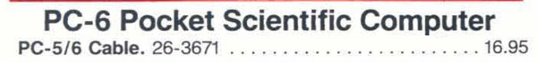 An ideal tool for engineers and students, the PC-6 combines the best features of a powerful scientific calculator and a pocket computer. Performs up to 65 built-in scientific calculations - or write your own programs in BASIC or assembly language. Retains programs and data even when power is off. A built-in Note and Address File keeps important telephone number or engineering data and formulas handy. Features an easy-to-read, 24-character LCD. Uses PC-4 Cassette Interface and Printer with PC-5/6 Cable (all sold separately). 8K RAM. Folds up to only 3/4 x 1-13/16 x 5-5/8". Includes battery.