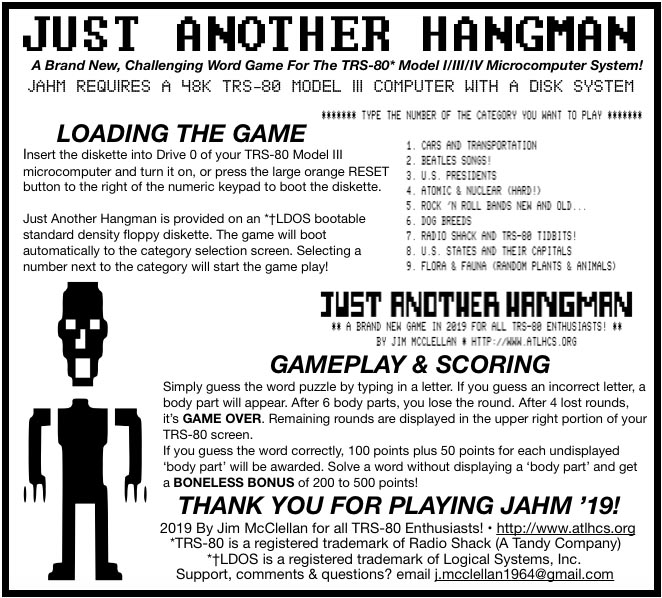 Jim McClellan has just written "Just Another Hangman" for the Model I and Model III, and wants everyone to enjoy it.