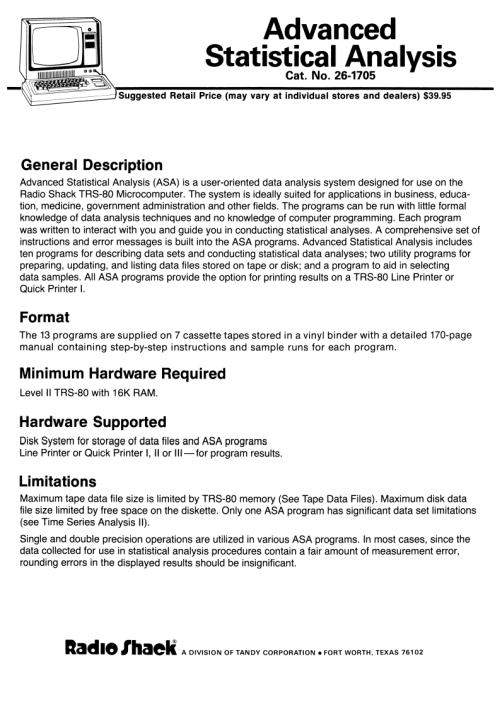 Title: TRS-80 Model I Software Library - Advanced Statistical Analysis [26-1705]