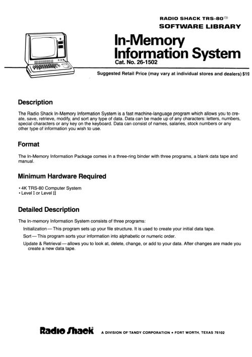 Title: TRS-80 Model I Software Library - In-Memory Information System [26-1502]