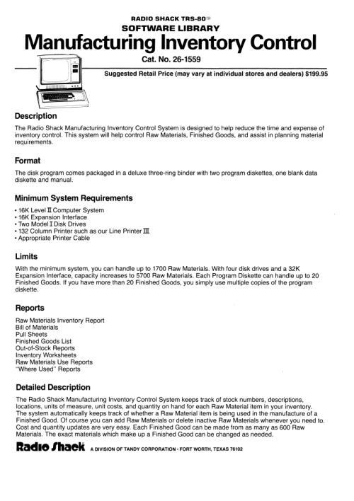 Title: TRS-80 Model I Software Library - Manufacturing Inventory Control [26-1559]