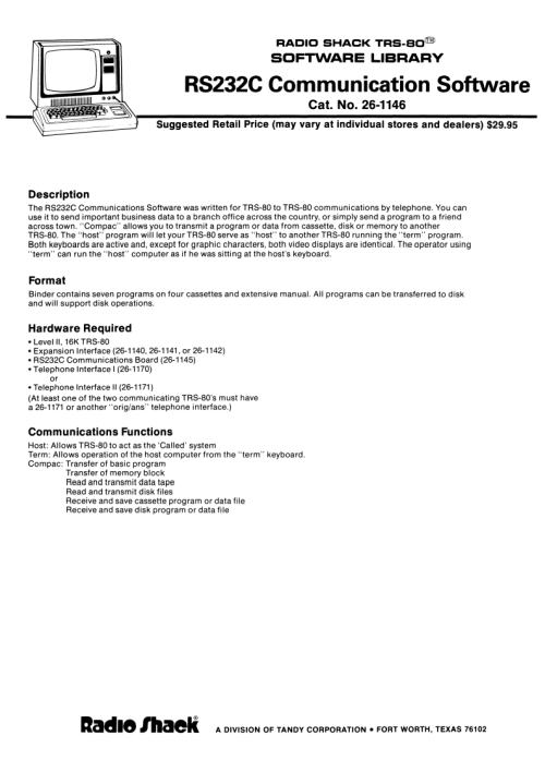 Title: TRS-80 Model I Software Library - RS232C Communication Software [26-1146]