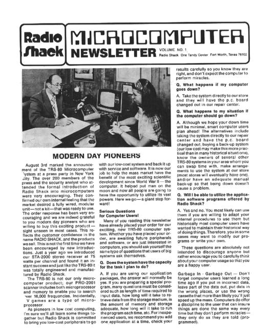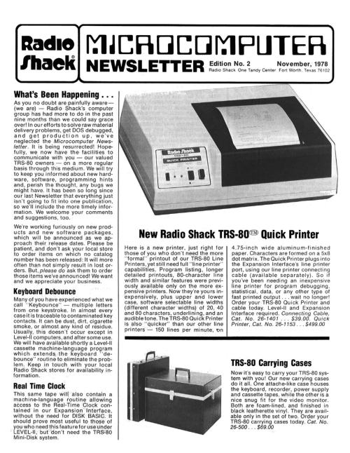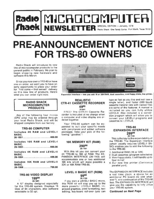 | 1 | Pre-Announcement Notice for TRS-80 Owners TRS-80 Video Display, Realistic CTR-41 Cassette Recorder, 16K Memory Kit, Level II BASIC Kit, TRS-80 Expansion Interface, TRS-80 Line Printer, TRS-80 Screen Printer, TRS-80 Mini Disk. |