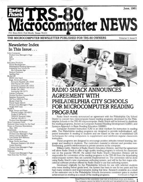 | 2 | New Software from Radio Shack Invasion Force, Micro Movie, Micro Marquee, Level II BASIC Course Part II, Advanced Statistical Analysis |