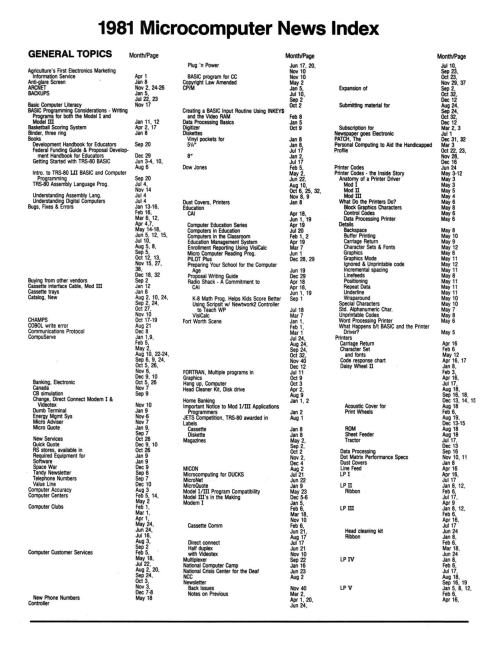 - 80 MICRO - is aimed at the user who wants to get more out of his machine. It includes tutorials on beginning and intermediate BASIC and Assembly programming, tips on making better use of commercial software, software and hardware reviews, buyer's guides, news, new product information and 12 to 20 programs each month the user can type in.