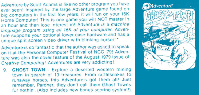 Adams Adventure 09: Ghost Town v1.23 [Tape Version] | 1 | CMD | Scott Adams / Adventure International | 1981 | En | 010-0009 | sa9123c1 |     |