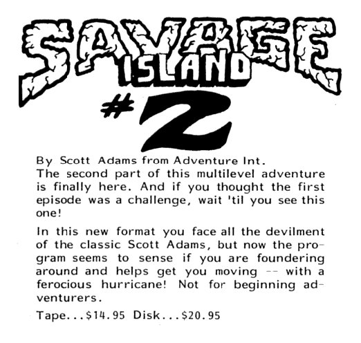 Adams Adventure 11: Savage Island II v1.33 | 3 | CMD | Scott Adams / Adventure International | 1981 | En | 010-0128 | sac1113x |     |