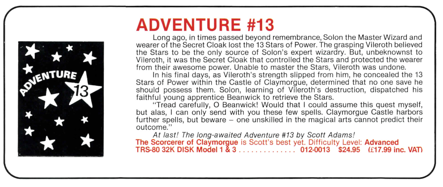Adams Adventure 13: Sorcerer of Claymorgh Castle v1.26 [Original] | 1 | DMK | Scott Adams / Adventure International | 1984 | En | 012-0013 | sad126d3 |     |