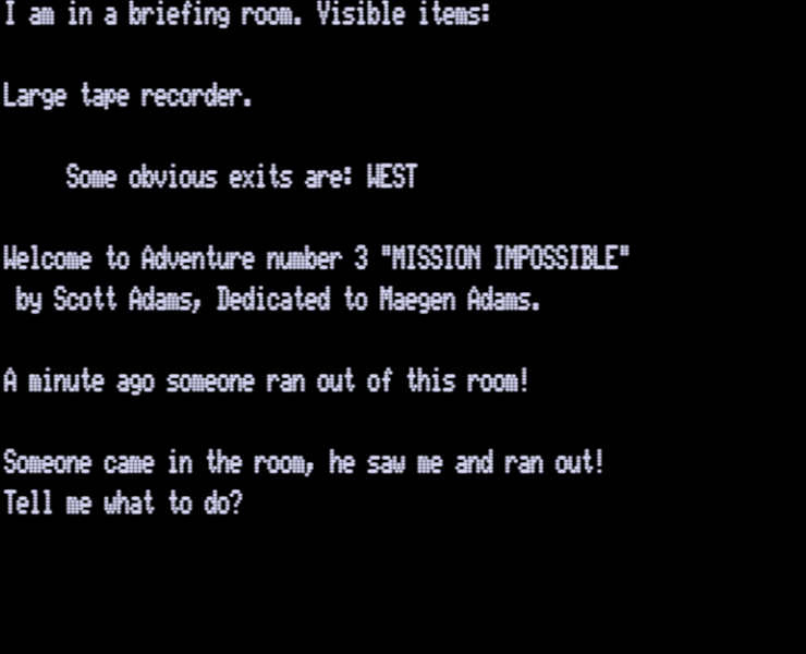 Adams Adventure 03: Mission Impossible v3.00 [Tape Version][Interpreter v7.4] | 1 | CMD | Scott Adams / Adventure International | 1979 | En | 010-0003 | sa3300c1 |     |