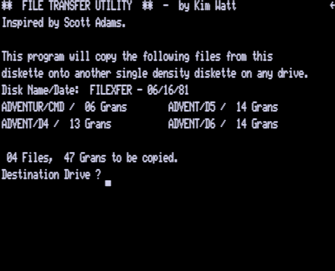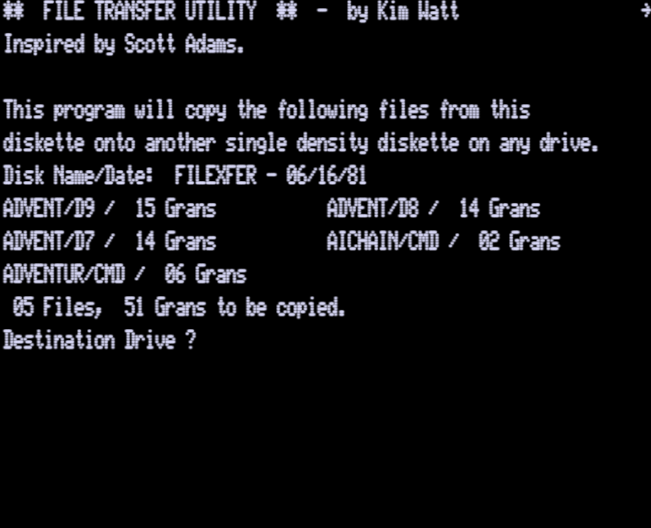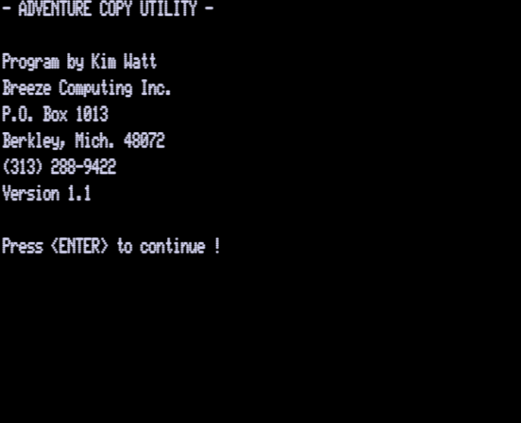 Scott Adams Adventure Copy Program | 1 | CMD ASM | Kim Watt | ???? | En | | saadvcpy |  |