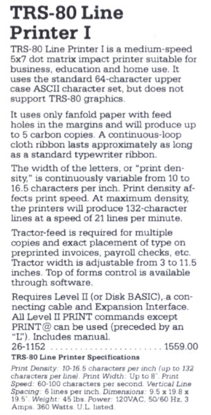 TRS-80 Line Printer I is a medium speed 5×7 dot matrix printer suitable for business, education, and home use. It uses the standard 64-character upper case ASCII character set, but does not support TRS-80 graphics.