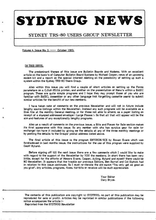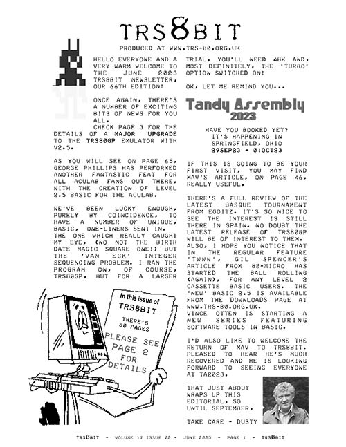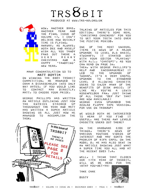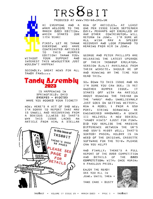 In this issue, the competition winner, Matt Boytim, explains, in detail, just how he managed to get his disassembler down to 887 bytes. George Phillips gives details of all the entries throughout the year. Al Wallace has sent details of his enhanced Star-Trek program. Ian Mavric sorts out M2 Rifa caps. for the Model 2, reports a Co-Co PIA chip mix-up and shows everyone just how fantastic the 2023 Tandy Assembly was. George Phillips takes the lead in upgrading BASIC Level 2.5 (TWOHAF) after I looked to see just how good ChatGPT is at creating Z80 code (and other bits while I was at it!). Brian K White keeps a CGP-115 printer (one of my favourites bits of kit) running.